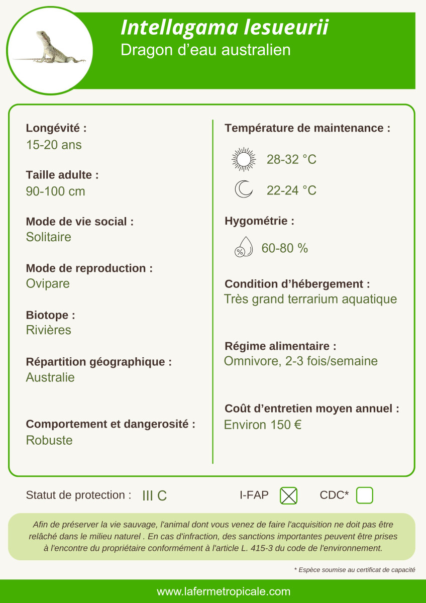 Le dragon d'eau australien (Intellagama lesueurii) est moins connu que son cousin du Vietnam le Physignathus cocincinus. Ce grand lézard atteignant presque un mètre à un superbe aspect : les mâles possèdent un ventre rouge brique. Arboricole, il occupe les zones ouvertes et rocailleuses aux abords de cours d'eau. On le trouve également parfois près des habitations humaines.