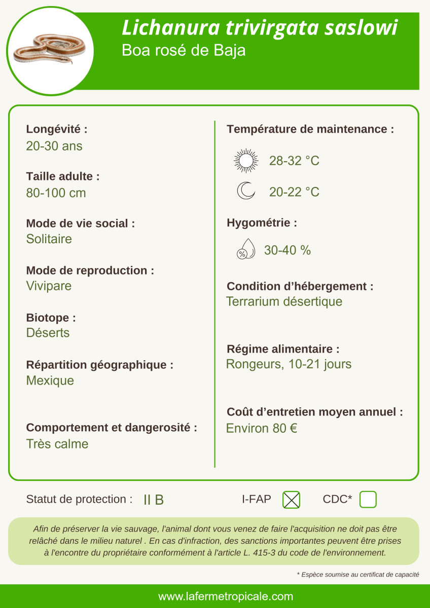 Le boa rosé de la Baja est l'un des plus petits représentants de sa famille, avec une taille inférieure à un mètre à l'âge adulte.