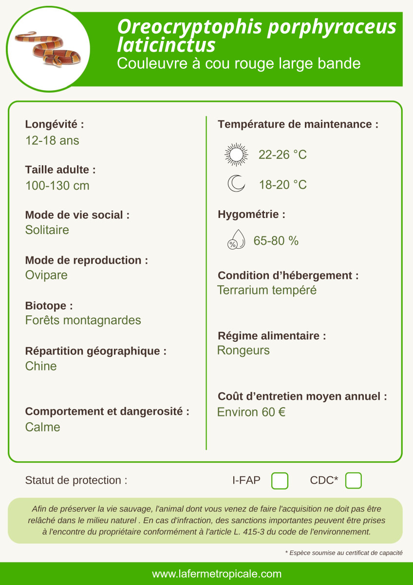 Oreocryptophis porphyraceus laticinctus est une couleuvre asiatique méconnue qui a été décrite en 1998. Elle vit dans les zones montagneuses de Malaisie et de Sumatra. C'est une petite espèce de 90 cm. Elle a besoin d'une température fraîche de 24-26°C le jour et d'une forte humidité. Timide, de nombreuses cachettes sont indispensables.