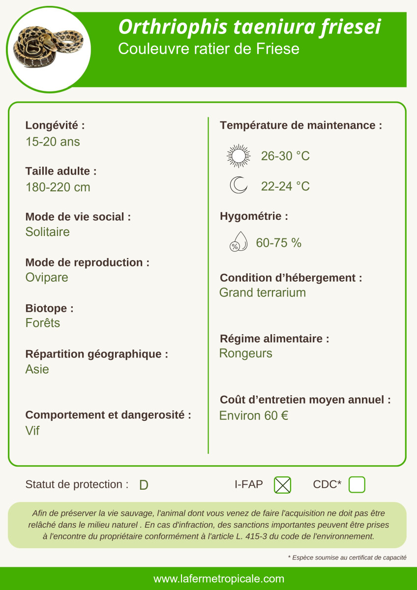 Cette couleuvre asiatique originaire de l'île de Taïwan est une espèce fréquente en élevage. Encore massivement consommée pour l'alimentation humaine, elle n'est plus exportée depuis plusieurs années. C'est un très grand serpent docile mais vif capable de dépasser 250 cm ! Les changements de classifications placent désormais ce taxon dans le genre Orthriophis d'où le nouveau nom de Orthriophis taeniurus friesei. Vivant aussi bien le jour que la nuit, c'est un serpent semi-arboricole.