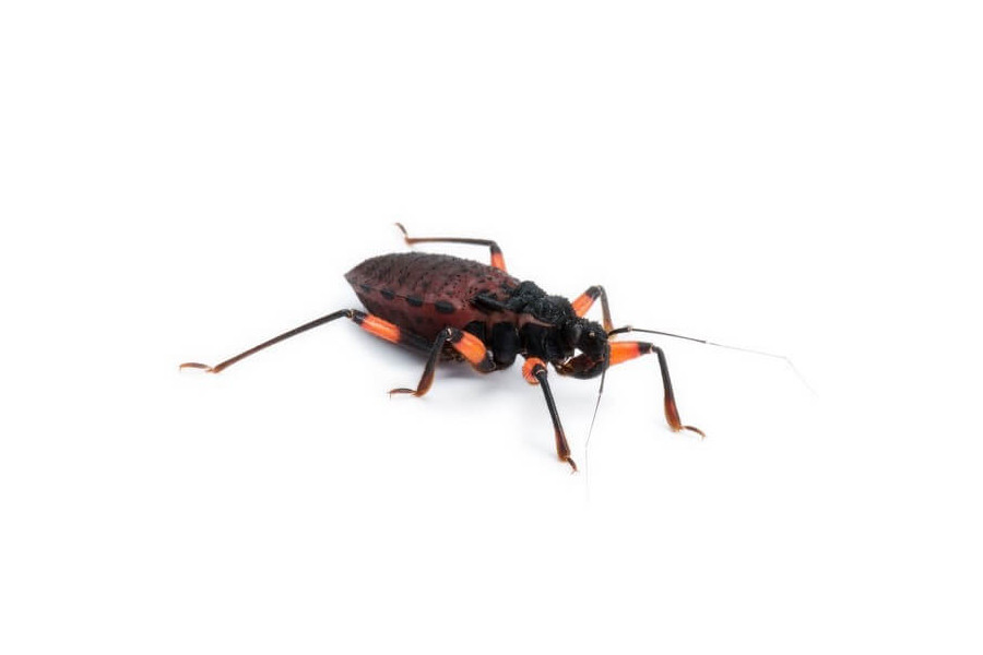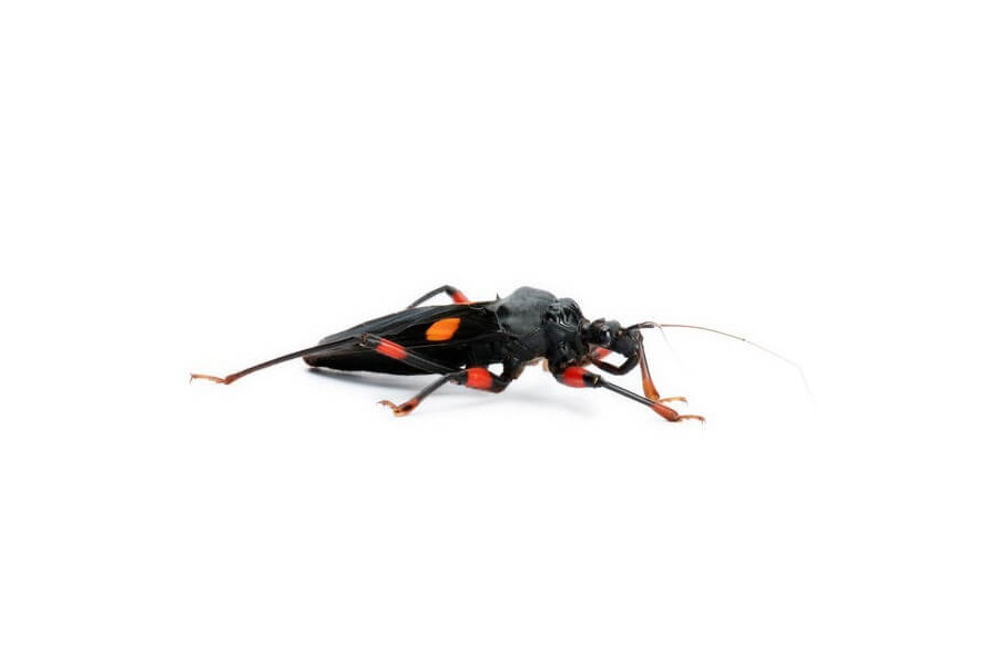 Cette réduve africaine est noire avec des marques rouges sur les pattes et oranges sur les ailes. Les Platymeris sont des punaises africaines insectivores de grande taille (jusqu'à 4 cm). Elles chassent avec une grande précision. Attention, les piqûres défensives peuvent être douloureuses, mais non dangereuses.