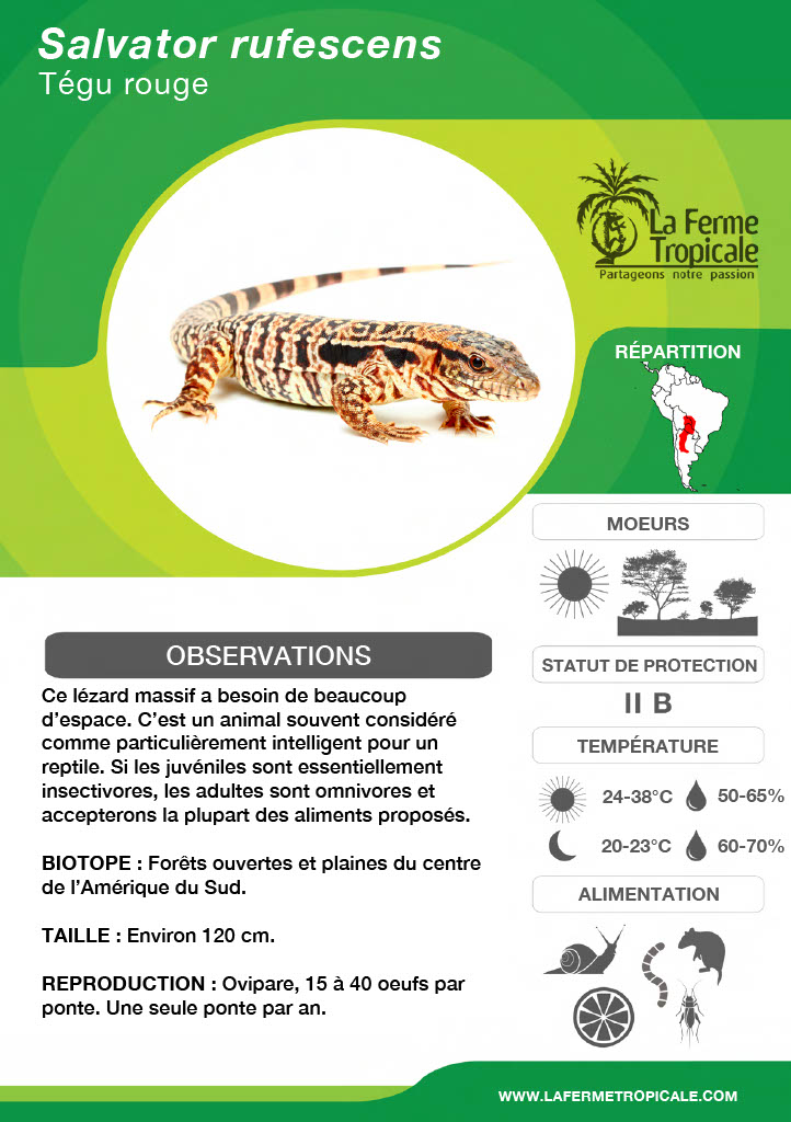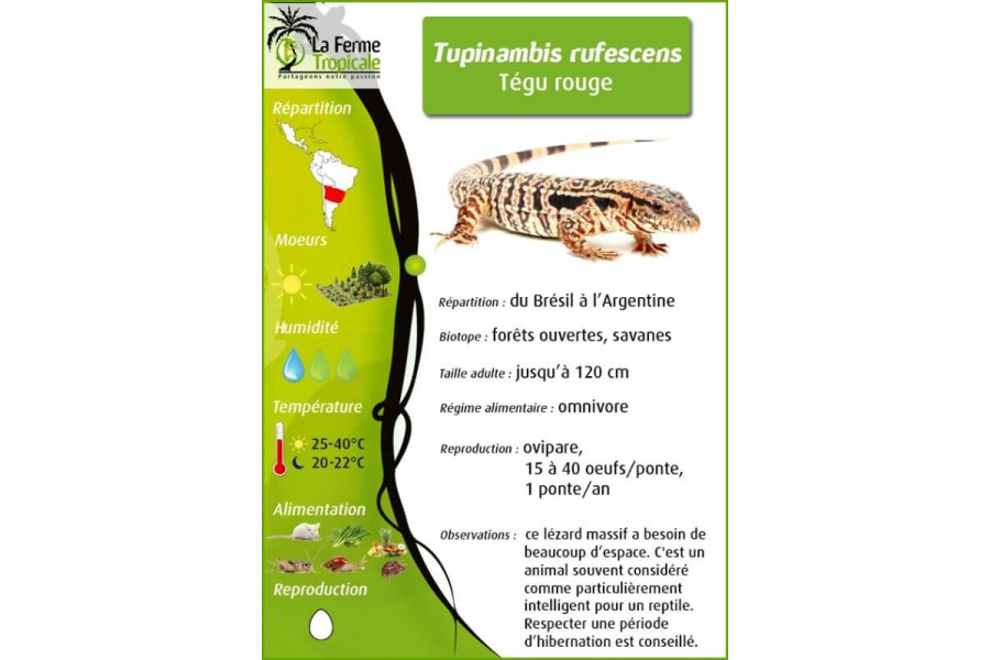 Le téju rouge est un grand lézard originaire d'Uruguay, Paraguay et Argentine. Il occupe un biotope plus sec que celui de son cousin le Tupinambis merianae. Capable d'atteindre 120 cm, c'est un remarquable prédateur. Opportunistes, toutes les proies sont acceptées.