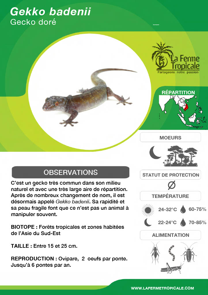 Ce gecko atteint une taille de 25 cm. Il est très commun en Asie du Sud Est. La maintenance en terrarium tropical humide est similaire au gecko tokay. Cette espèce est désormais nommée Gekko badenii.