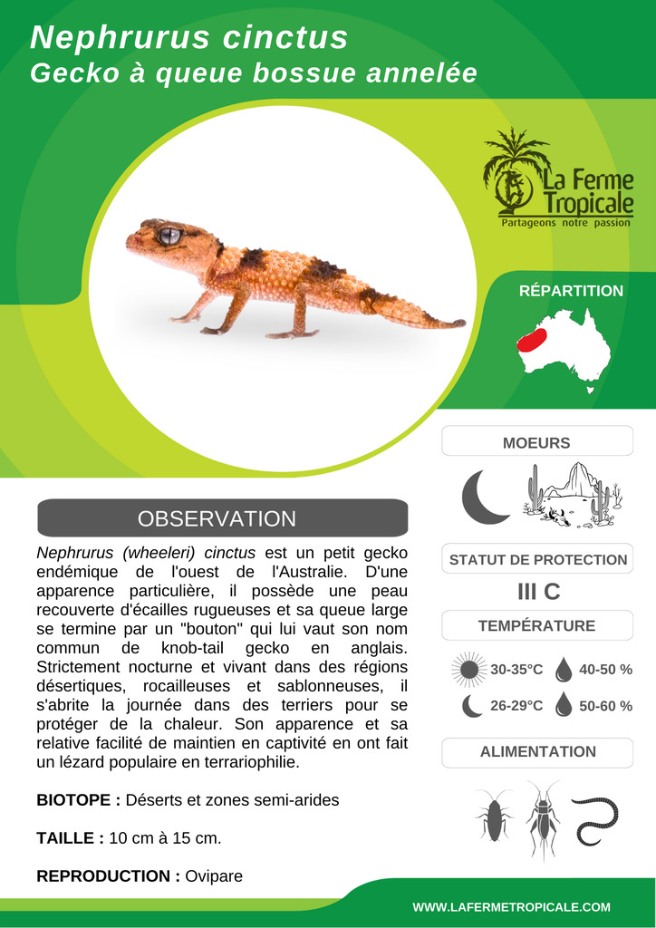 Nephrurus wheeleri est un petit gecko d'une dizaine de centimètres endémique de l'ouest de l'Australie. Les mâles mesurent en moyenne 10 cm a l'âge adulte contre 14 cm pour les femelles. D'une apparence particulière, il possède une peau recouverte d'écailles rugueuses et sa queue large se termine par un "bouton" qui lui vaut son nom commun de knob-tail gecko en anglais. Strictement nocturne et vivant dans des régions désertiques, rocailleuses et sablonneuses, il s'abrite la journée dans des terriers pour se protéger de la chaleur.