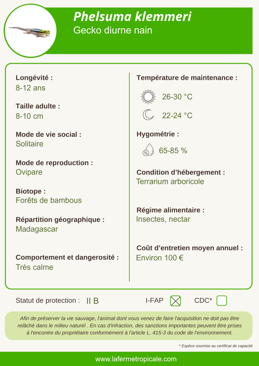 Décrit seulement en 1991, Phelsuma klemmeri est parfois appelé le gecko néon en raison de ses couleurs extrêmement vives. Il provient de Madagascar où il occupe une minuscule aire de répartition au nord-ouest de l'île, composée de forêts de bambous humides. C'est une petite espèce atteignant 9-10 cm une fois adulte. D'un comportement diurne et arboricole, ce gecko et particulièrement rapide et actif. Il se nourrit de petits insectes et de pulpe de fruits mûrs.