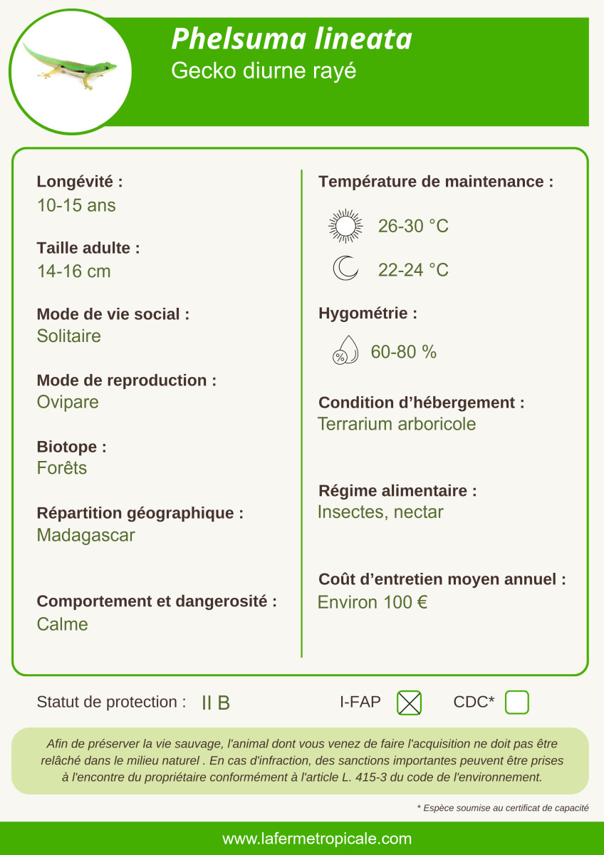 Ce gecko diurne originaire de Madagascar est un des Phelsuma les plus communs. Rapide et véloce, ce lézard à la peau délicate ne se manipule pas. Les mâles mesurent de 10 à 12 cm et les femelles de 9 à 11 cm.