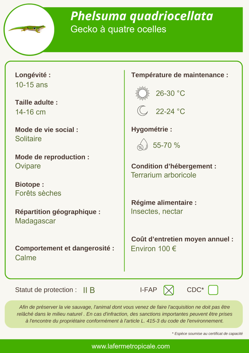 Ce Phelsuma doit son nom aux quatre ocelles noires et bleues qui ornent le côté de son corps, au niveau des pattes. Il occupe la partie Est de l'île de Madagascar. Il atteint 12 à 13 cm.