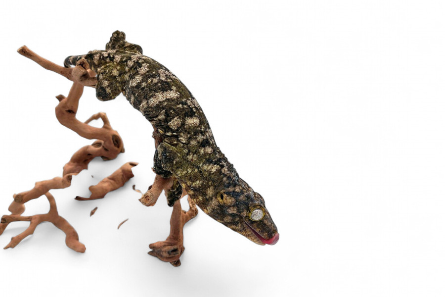 Ce gecko géant endémique des forêts tropicales de Nouvelle-Calédonie peut atteindre 40 cm ! C'est une espèce nocturne et cryptique imitant l'aspect des troncs et branches. Les mâles sont agressifs entre eux.