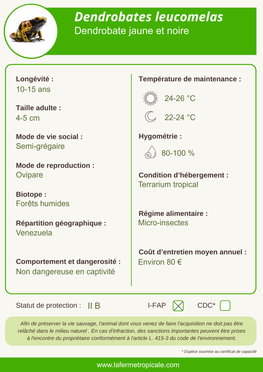 Cette grenouille est une des plus communes Dendrobates en terrarium. C'est un bon choix pour débuter avec ces grenouilles. En terrarium, les toxines propres à l'espèce disparaissent faute d'un régime alimentaire similaire à celui de leur forêt tropicale du Venezuela et Guyana.