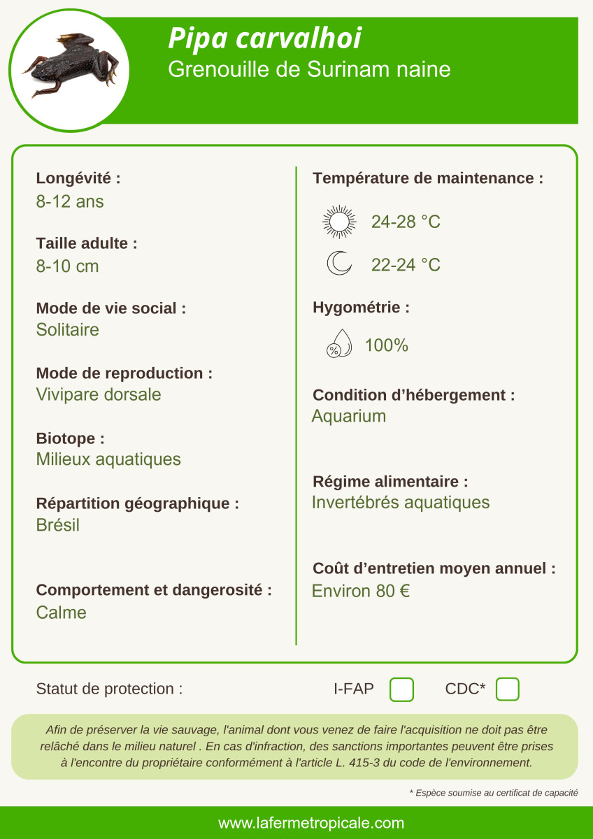 Cette grande espèce de Pipa (3 à 6 cm) est apparue récemment en élevage. Cette espèce provient originellement de l'est du Brésil.