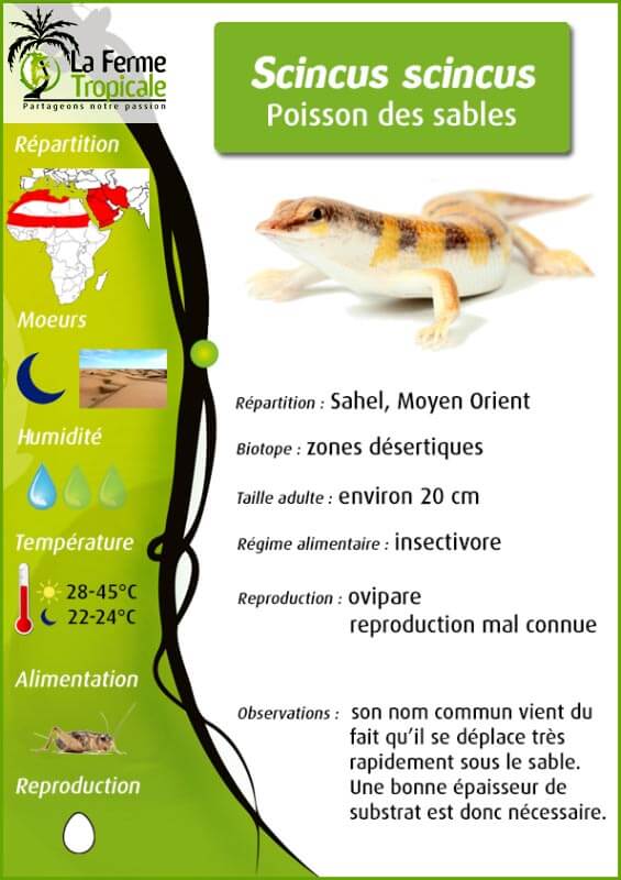 Scincus scincus est un lézard du Sahara qui est appelé "poisson des sables" en raison de sa capacité à se déplacer à grande vitesse sur le sable et sous la surface, comme s'il nageait. Sa morphologie est entièrement adaptée à cette particularité : le corps est élancé, la peau lisse, les yeux sont petits et recouverts d'une écaille transparente, les orifices auditifs sont recouverts et le museau est profilé pour pénétrer le sable. Bien qu'il lui arrive de se déplacer à la surface, il vit la plupart du temps enterré à 10 à 80 cm de profondeur, attendant ses proies qu'il détecte grâce aux vibrations du sable dues à leurs mouvements.