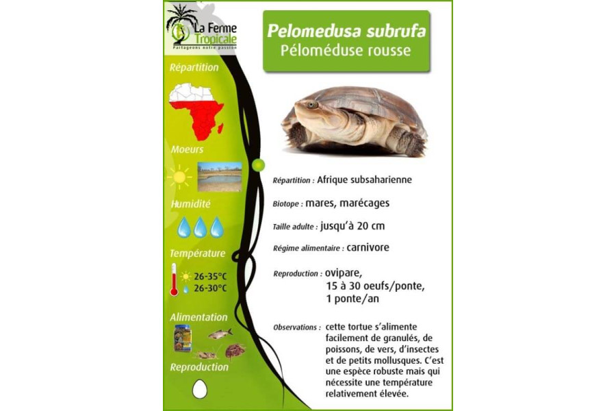 Pelomedusa subrufa est sans conteste la tortue africaine avec la plus grande répartition. C'est une tortue aquatique dépassant rarement les 20 cm. Elle se trouve sur toute l'Afrique sub-saharienne, sauf en forêt tropicale. Cette espèce est commune dans beaucoup de pays dans des mares temporaires naturelles ou artificielles, différents cours d'eau, criques et rivières. Le climat sur place est constamment chaud avec une saison sèche durant laquelle la tortue estive (elle peut alors s'enterrer dans la boue).