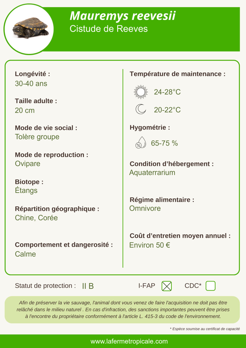 Classée en colonne B de l'annexe 2 de l'arrêté du 8 octobre 2018, la détention de cette espèce jusqu'à 25 spécimens est soumise à déclaration (https://www.lafermetropicale.com/content/44-faq-reglementation). Ces animaux sont identifiés par puce électronique ou photo conformément aux obligations légales.