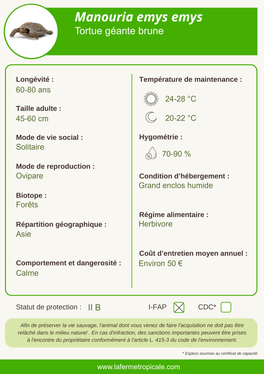 Manouria emys emys est une grande tortue terrestre avec 40 cm pour 20 Kg en moyenne. Elle occupe les zones de forêts humides et les flancs de montagne en Indonésie et Malaisie. Comme la G.sulcata, elle possède une écaillure saillante, ayant des formes de pointe sur les pattes et les cuisses.