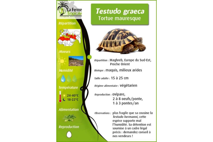 C'est la fameuse « Tortue de jardin ». Attention à ne pas se méprendre !!! Cela ne signifie en aucun cas qu'elle peut se contenter d'être placée en extérieur, sans un aménagement approprié répondant à ses exigences écologiques d'espèce méditerranéenne. Elle peut effectivement être élevée avec succès dans nos régions à condition de respecter certaines règles de maintenance, surtout durant les premières années de sa vie. Il est par conséquent fondamental de bien se documenter avant d'en faire l'acquisition !