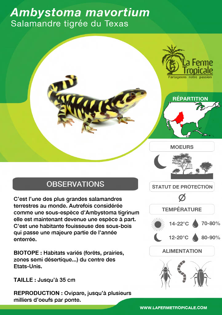 Autrefois considérée comme une sous-espèce d'Ambystoma tigrinum, Ambystoma mavortium ou la salamandre tigrée du Texas est maintenant devenue une espèce à part. Cette salamandre massive atteignant 30 cm occupe une grande aire de répartition à l'ouest des États-Unis et du Canada. C'est une habitante fouisseuse des sous-bois qui passe une majeure partie de l'année enterrée. Sa reproduction est explosive : à la sortie d'hibernation au début du printemps, mâles et femelles se retrouvent en grand nombre dans les mares pour se reproduire massivement.